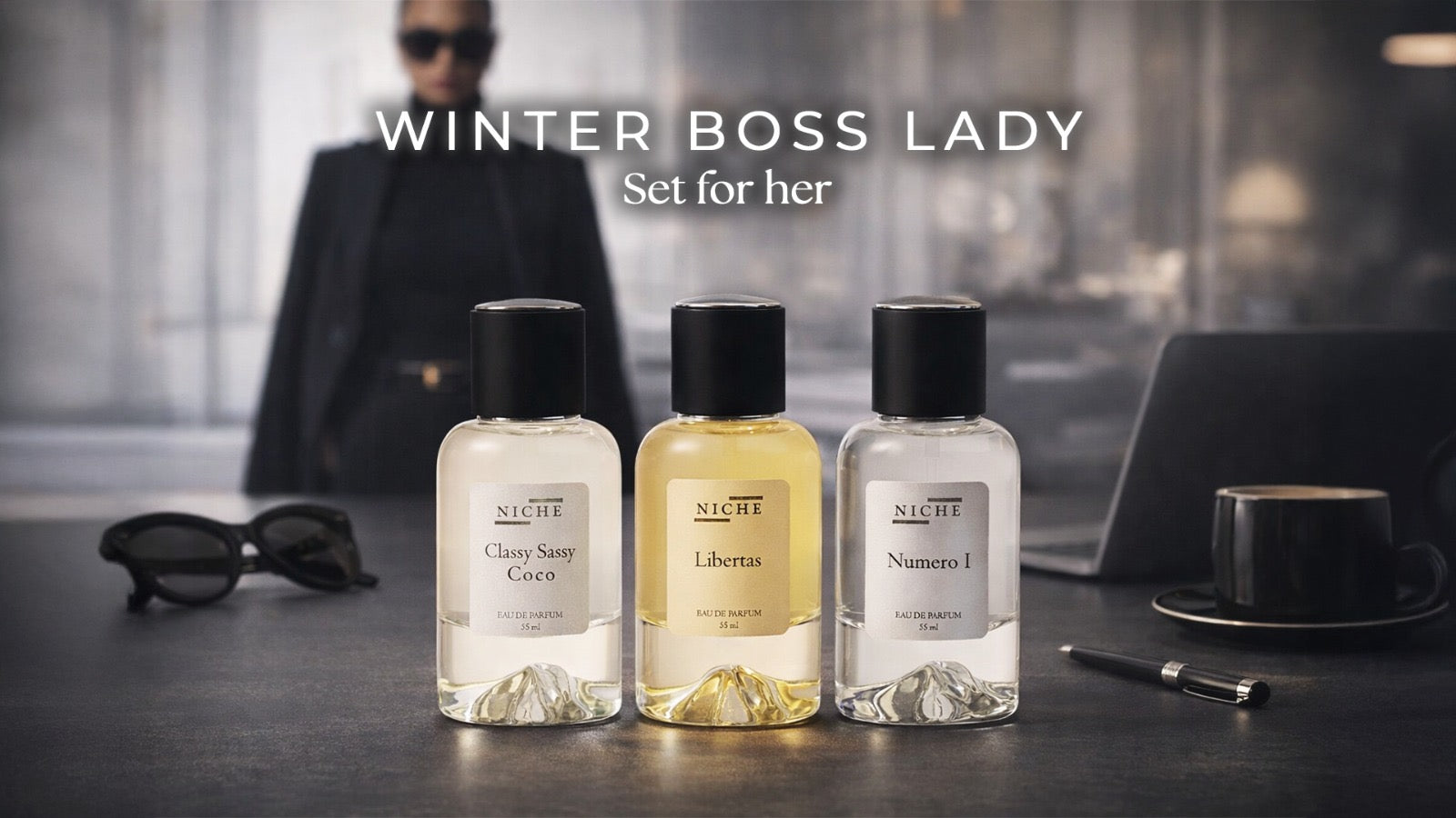 صُممت مجموعة "سيدة الأعمال الشتوية" للمرأة التي تملك كل غرفة تدخلها، وهي عبارة عن ثلاثية قوية من العطور الأنيقة والدافئة والعصرية - مثالية للأيام الباردة عندما يكون الحضور مهمًا والثقة بالنفس أمرًا لا جدال فيه.