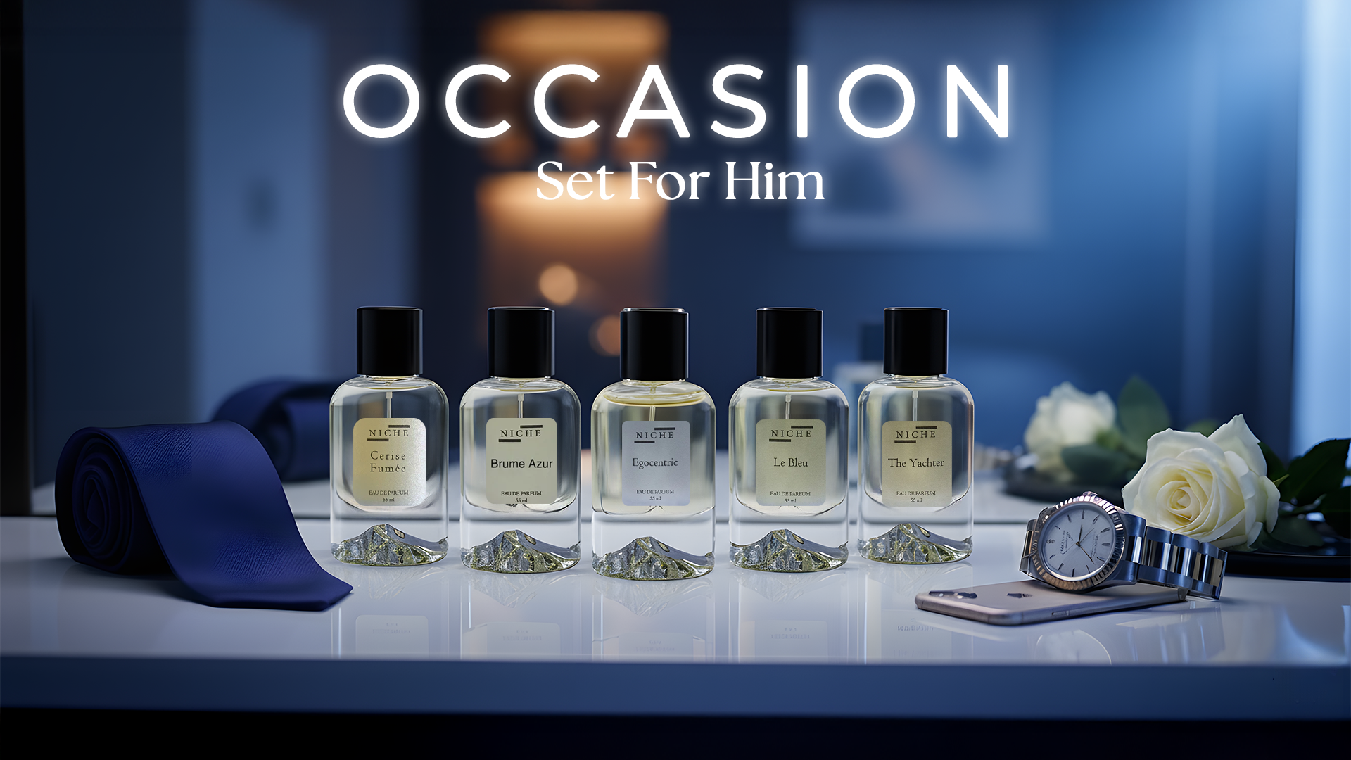 A curated edit of masculine excellence: one set, five moods, zero wrong choices. This is the occasion wardrobe — bottled.